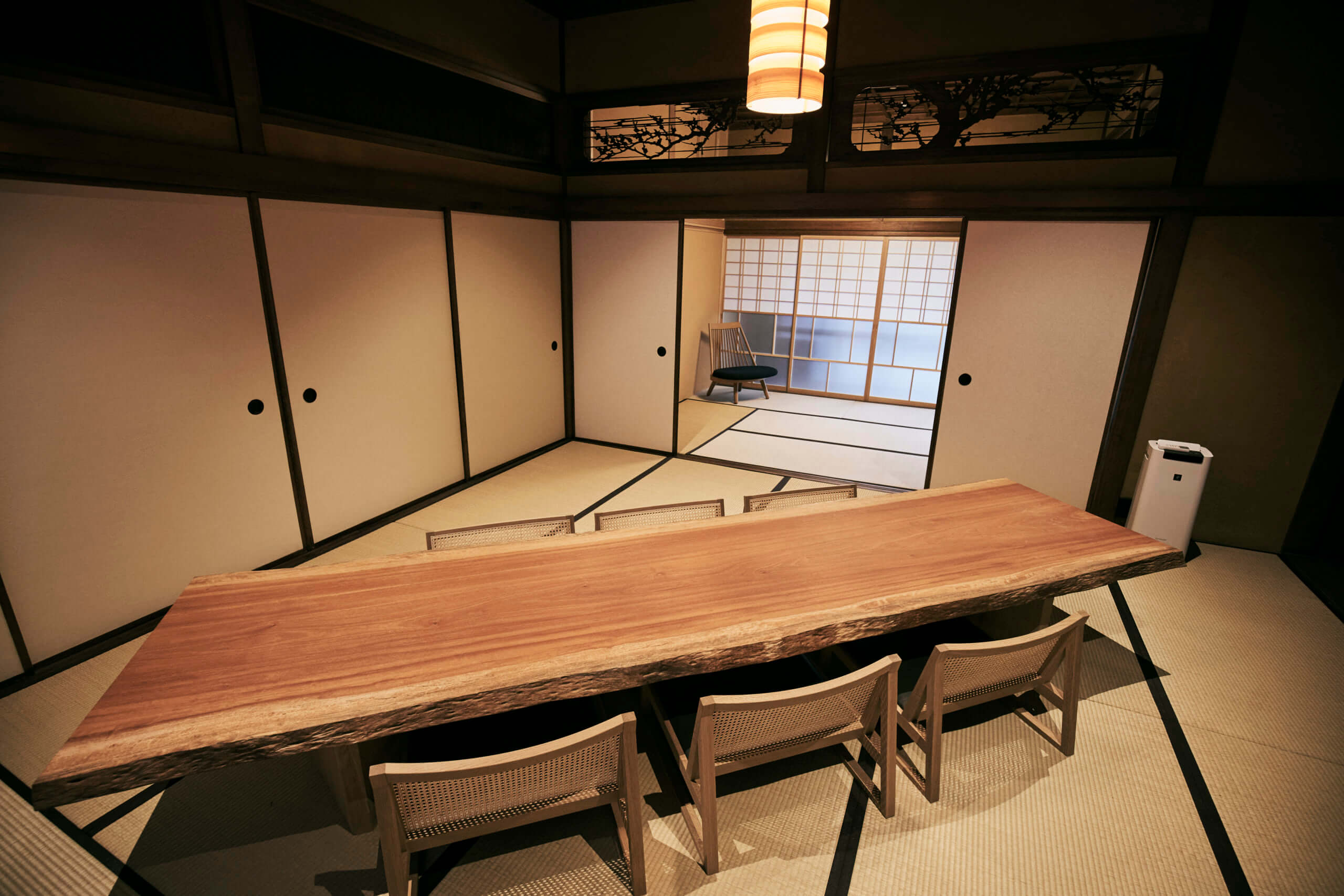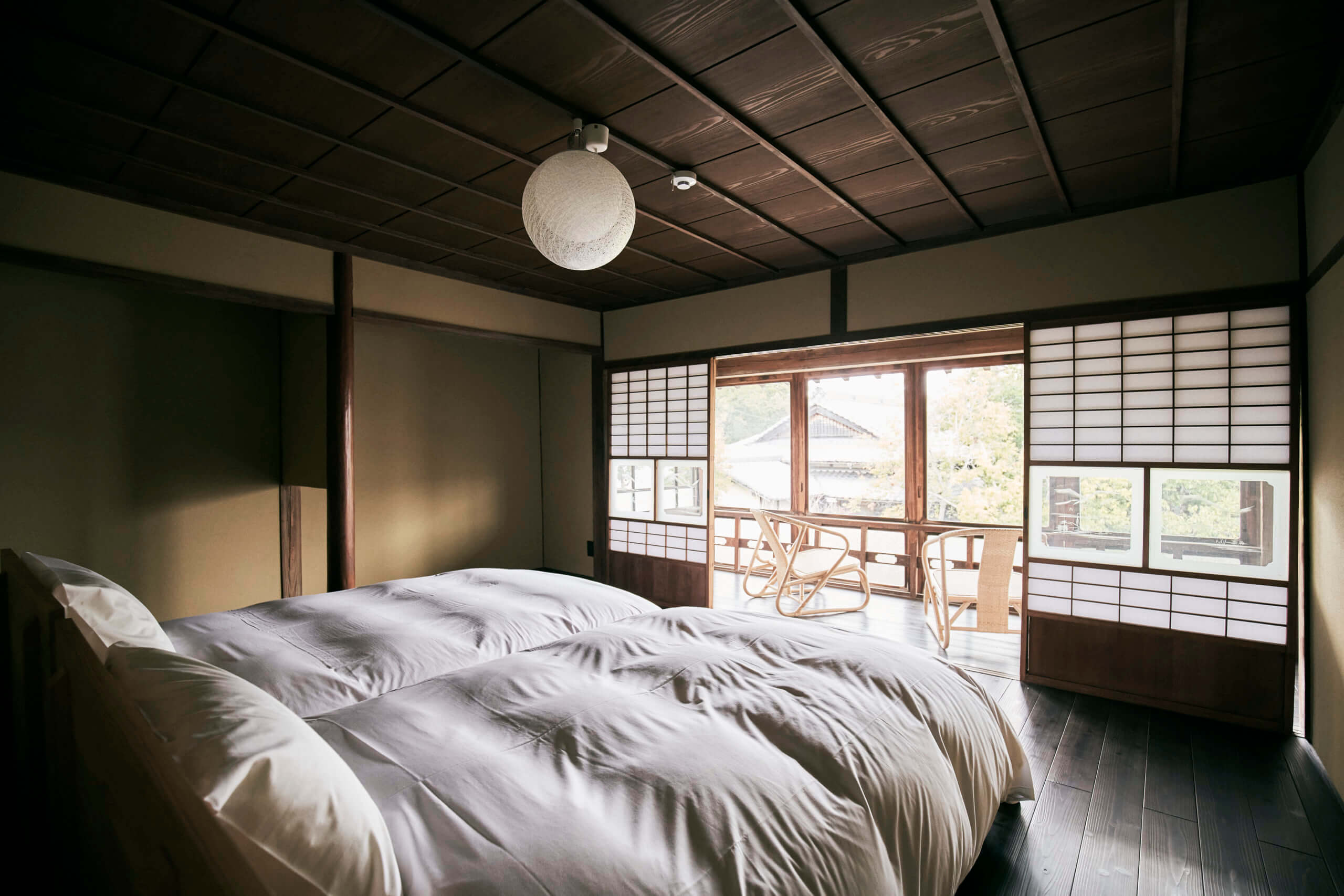 今夏にオープンする2棟の宿を案内してもらいました。まずは、白壁土蔵造りが立ち並ぶメイン通りに面した「みなも 碓井邸」。1918年築、土蔵造りで2階建ての大きな町家に、4組が宿泊できます。往時のものをできるだけ活かした情緒漂う部屋には、作り手の技術と温もりを感じられる家具がすんなりなじんでいました。