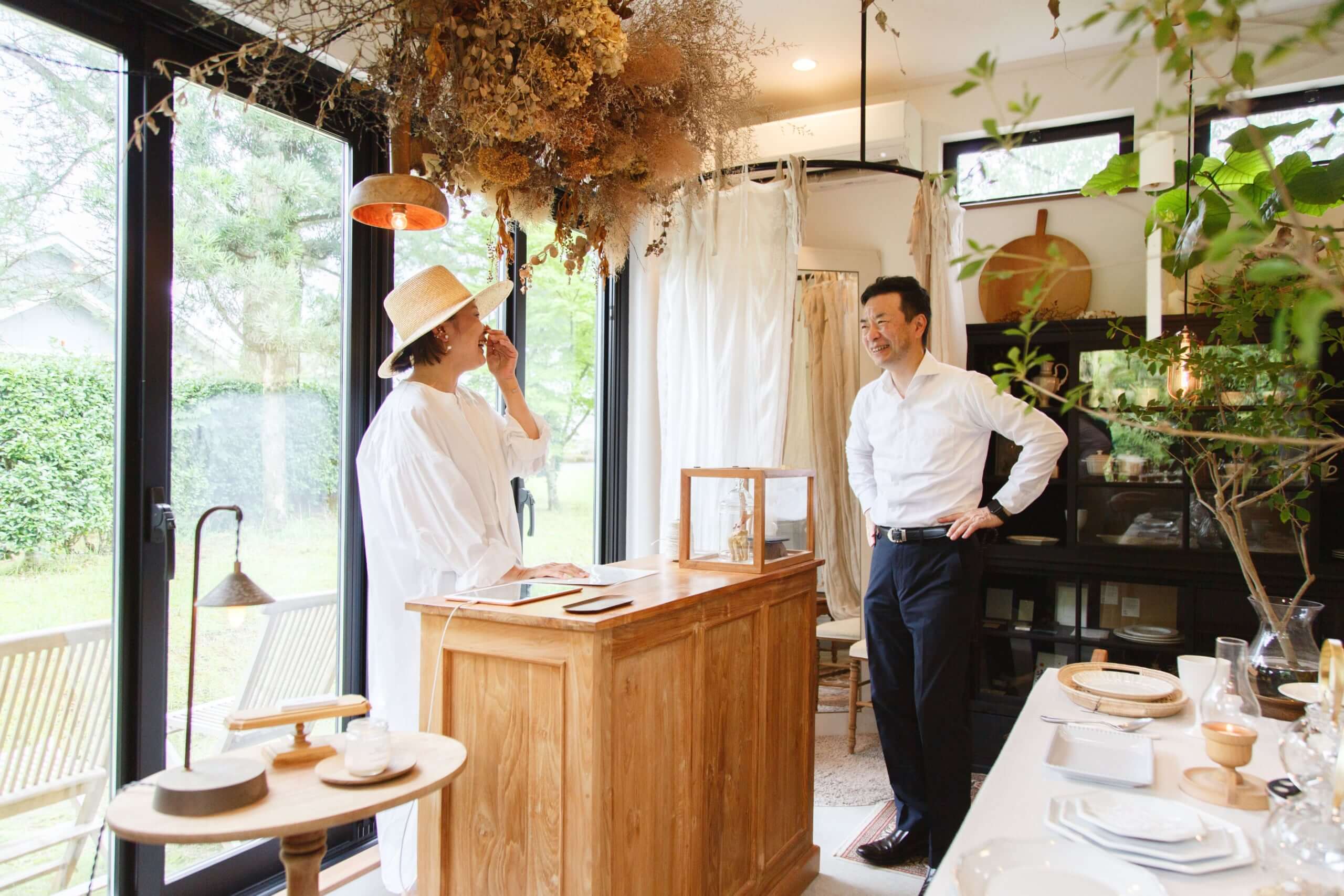 鎌苅:樋口さんのご案内で、福岡市内から移住した方のセレクトショップ「Maison Carré(メゾンカレ)」にお邪魔しました。もともと薬院でお店をされていて、美奈宜の杜の自然豊かな立地を活かしたとても素敵なお店でした。