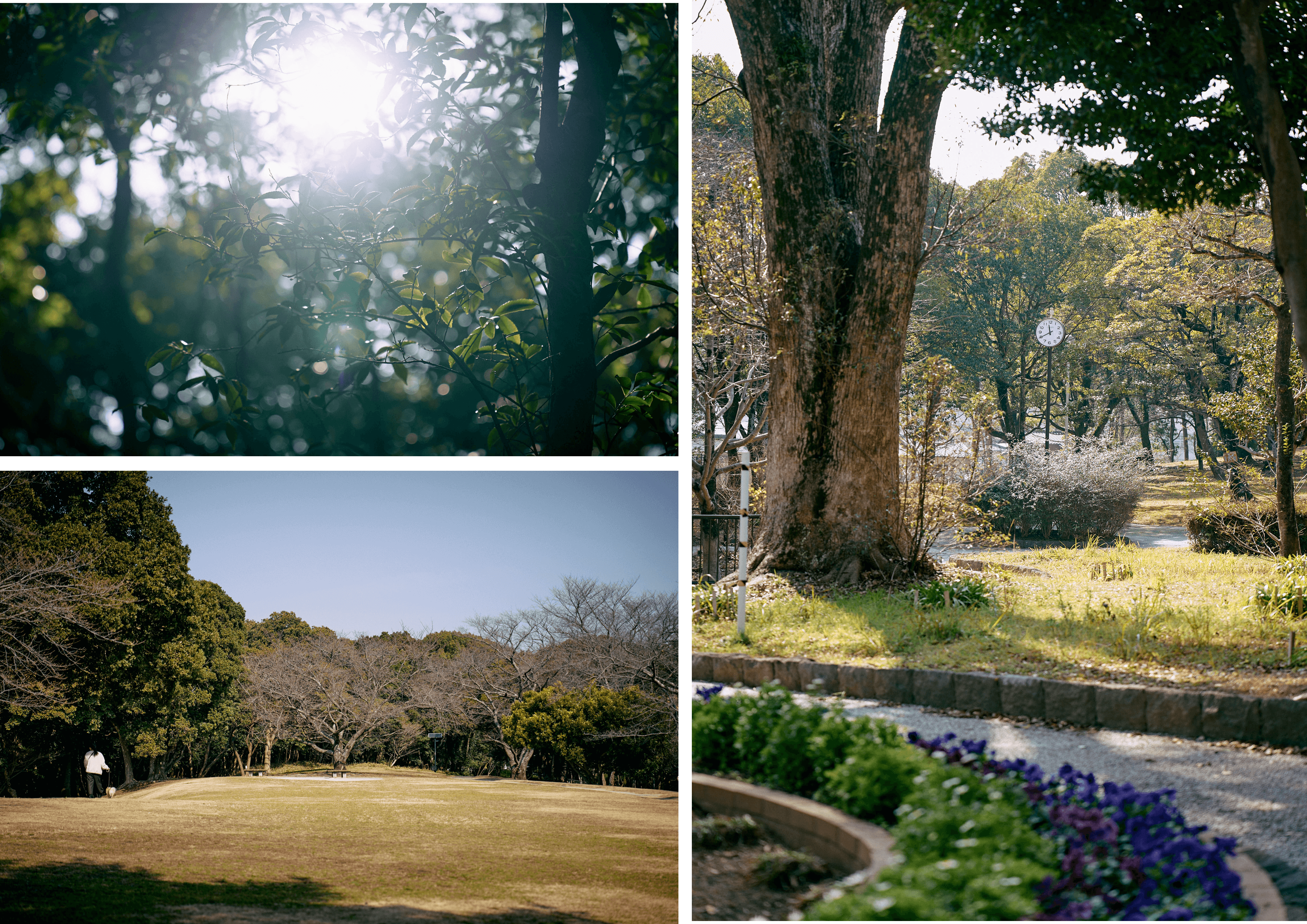左上/葉の隙間から差し込む眩しい朝日と、深呼吸したくなるような澄んだ空気。この豊かな環境を「自分の庭」のように使いこなすことで、究極のリトリートライフが完成します。左下/公園内の広大な芝生広場は、家族でのんびりピクニックを楽しんだり、休日を穏やかに過ごすのに最適な余白。自然の豊かさが、ライフスタイルをより豊かなものへと導きます。右/豊かな緑と手入れされた花々に包まれた公園の小道。時計台が静かに時を刻むこの空間は、日常の中に非日常の安らぎをもたらす特別な散歩道です。