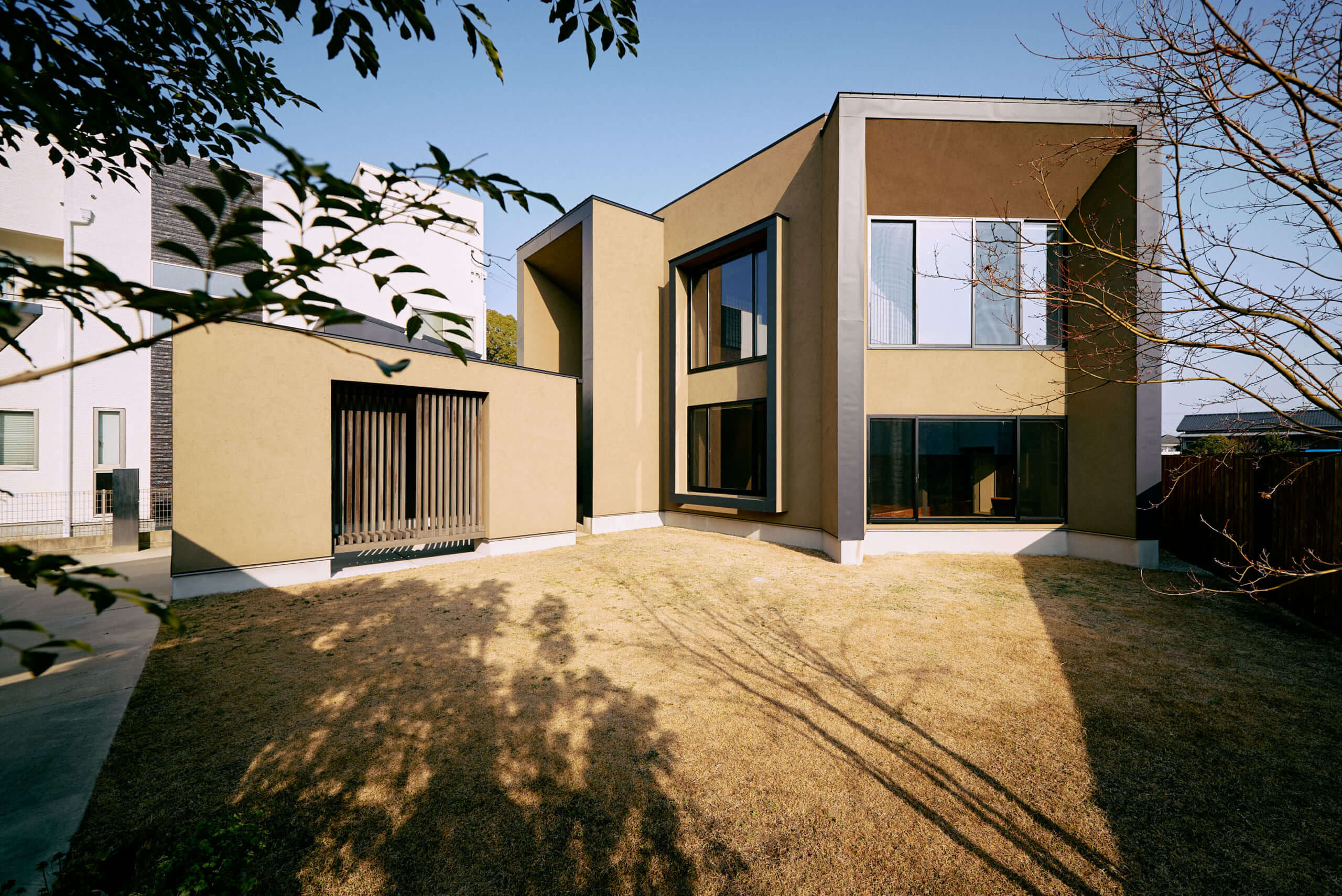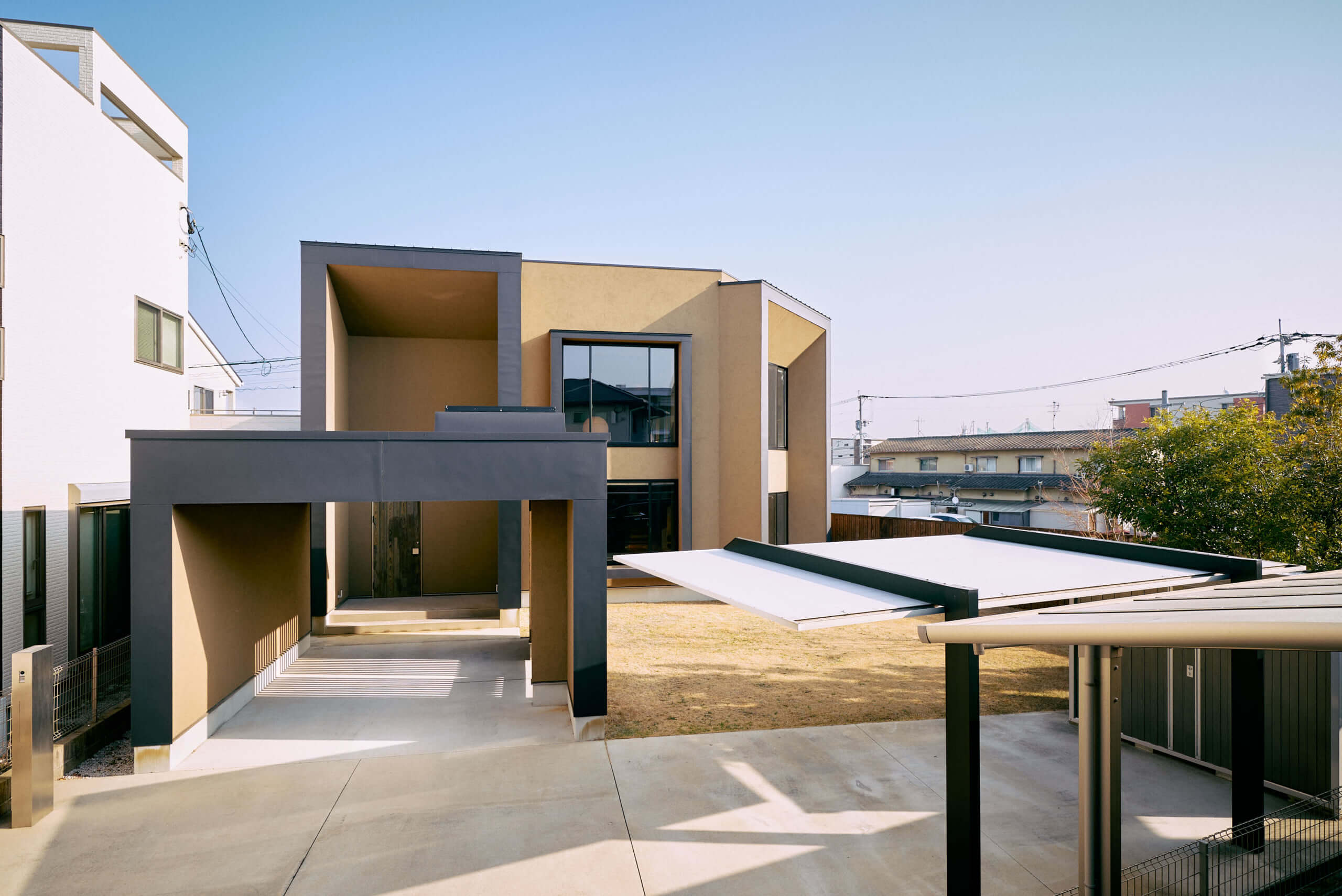 単なる四角い箱を組み合わせたのではありません。壁面を斜めに切り取ったようなフォルムや深いセットバック(くぼみ)を複雑に組み合わせた、まるで彫刻作品のような造形美が特徴です。温かみのあるアースカラーの塗り壁をベースに、各所にあしらわれたダークグレーの太いフレームが、全体の印象をシャープに引き締めています。