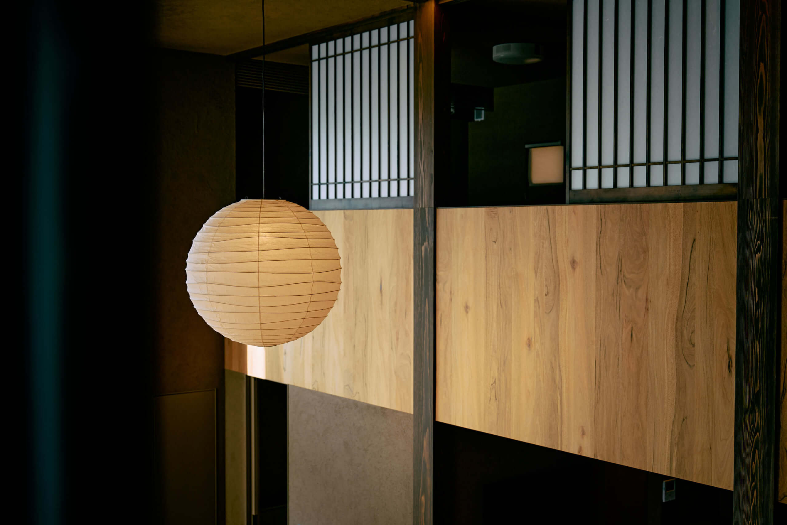 少しトーンを落とした空間にぽつんと浮かび上がるのは、和紙の風合いが美しい球体の大型ペンダントライト。和紙の繊維を通してこぼれる温かく静謐な灯りは、まるで月明かりのように空間を包み込みます。