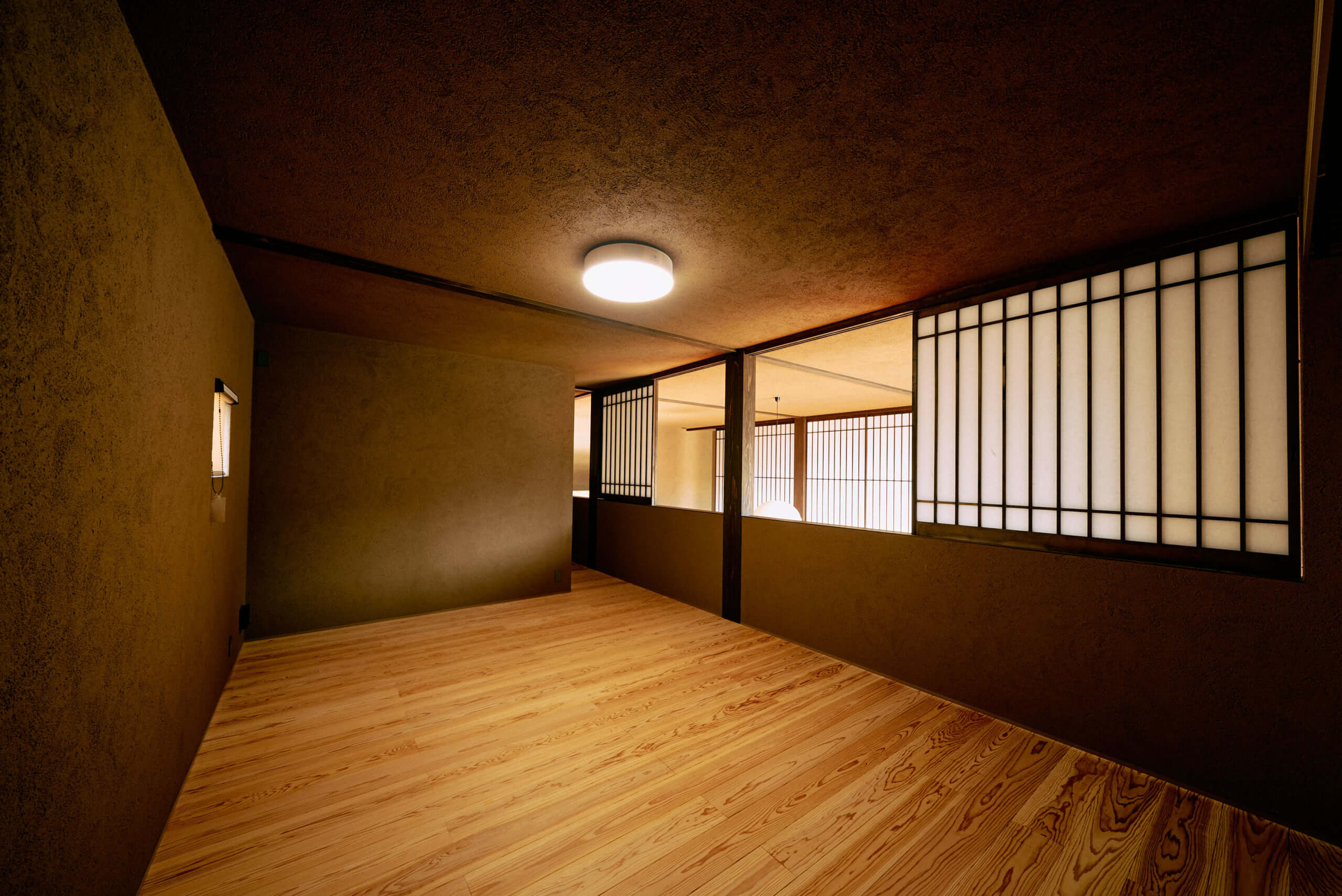 窓辺や部屋の間仕切りに多用された障子は、直射日光を柔らかく拡散させ、室内に優しい光のグラデーションを生み出します。