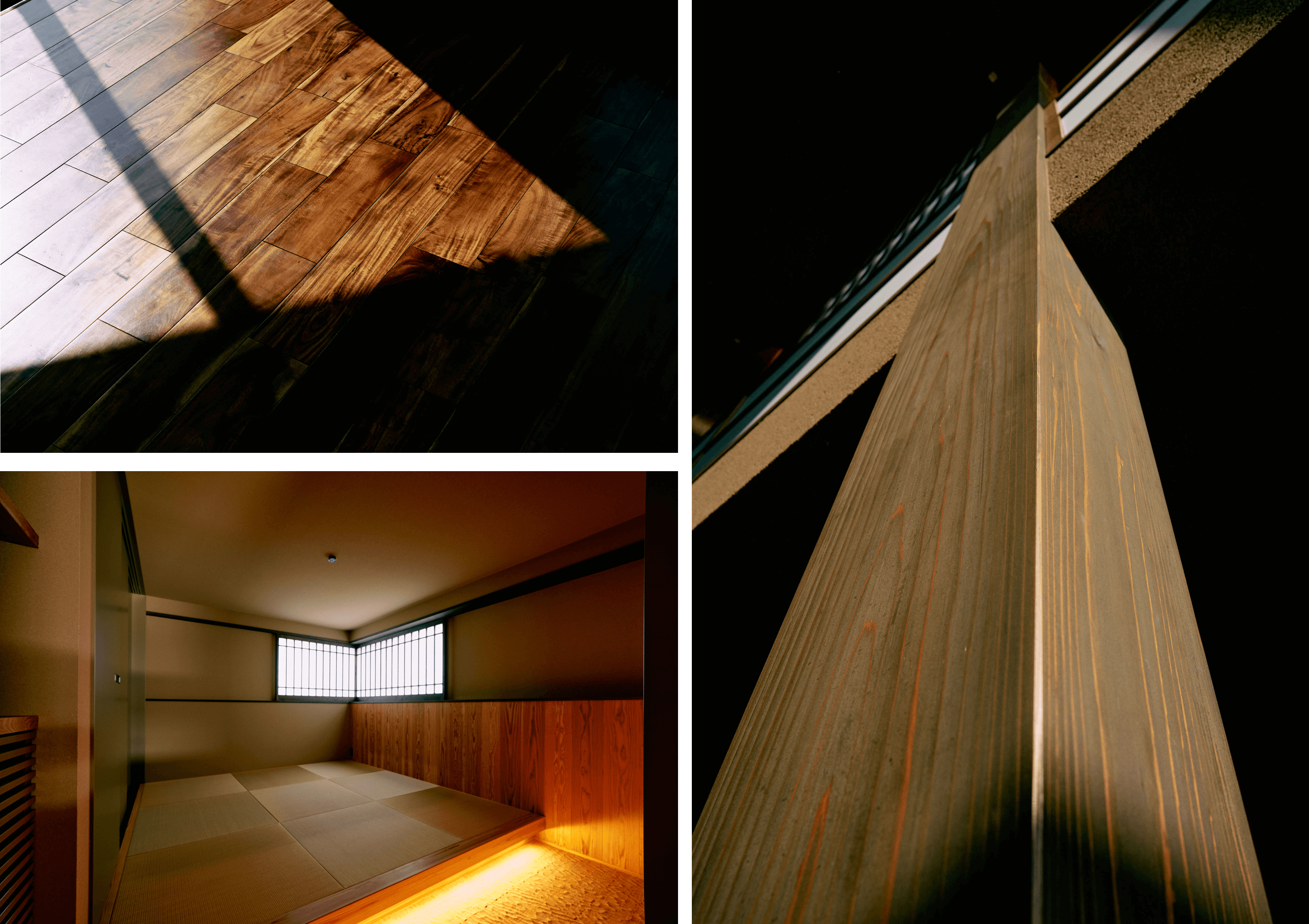 左上/床一面に敷き詰められたニッシンイクス社の無垢材『ミモザ』。茶褐色と白太の力強いコントラストが、差し込む光とシャープな影によってさらにエキゾチックな魅力を放ちます。 左下/足元に緻密に仕込まれた間接照明が、塗り壁のザラリとした凹凸を立体的に浮かび上がらせる和室。職人の手仕事と光の計算が織りなす、息を呑むほど美しいモダンな静寂の空間です。右/大空間の要所に配された無垢材の柱。天井に向かって力強く伸びる美しい木目が圧倒的な存在感を放ち、建物そのものが持つ生命力と、職人の確かな手仕事を物語っています。