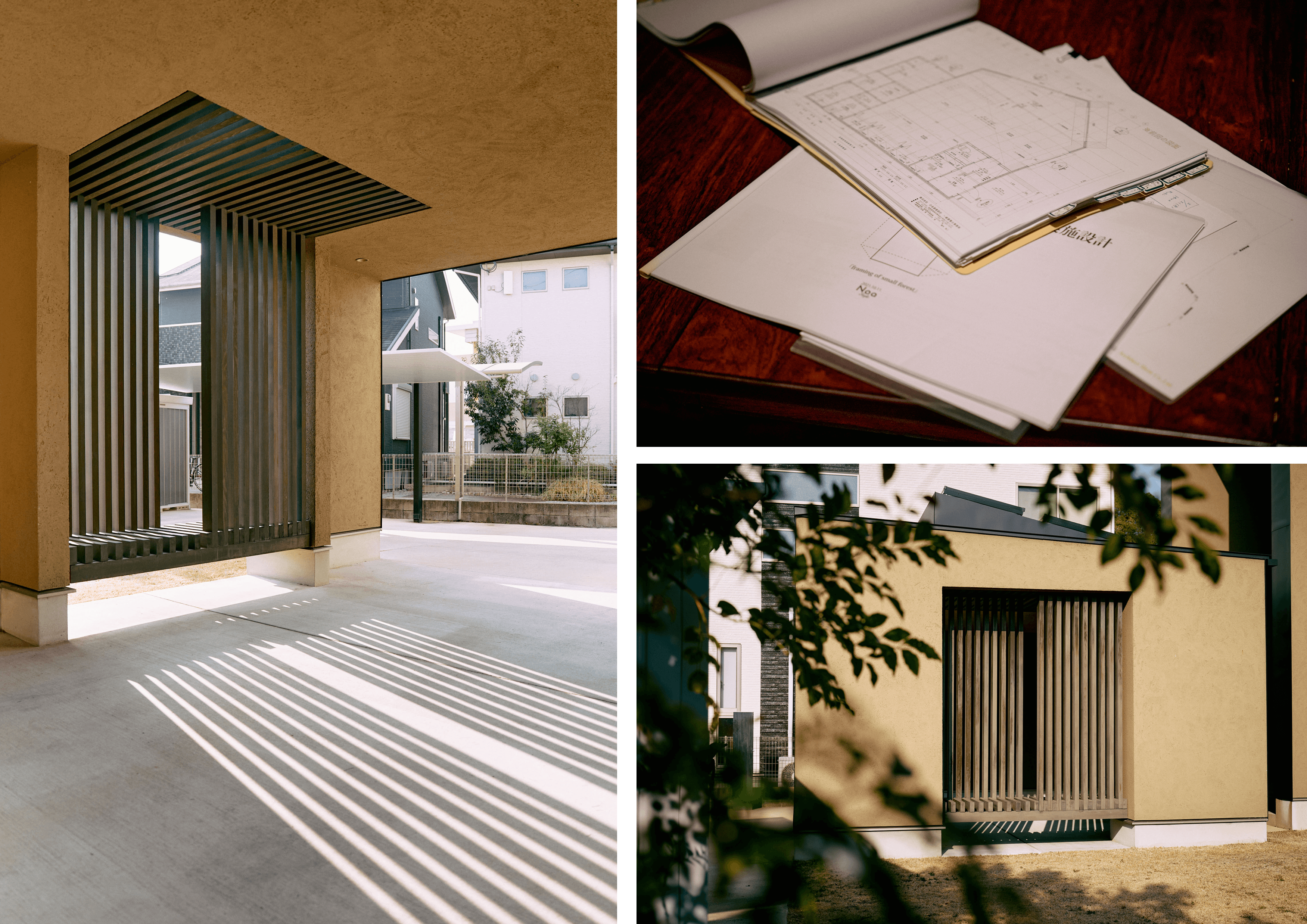 左/アプローチに設けられた木製ルーバーをすり抜けた自然光が、床面に幾何学的なストライプの影を描き出します。太陽の軌道まで計算し尽くされた、動くアートのような光と影の演出です。右上/「株式会社のあ建築設計」が情熱と技術の粋を集めて描いた、唯一無二の図面。厳選された本物の素材と緻密な設計美によって、「世界にひとつだけの我が家」が実現しました。右下/外壁の一部にあしらわれた木製ルーバー。外観デザインのモダンなアクセントになると同時に、室内に柔らかな光を取り込み、プライバシーを確保する機能性も兼ね備えています。
