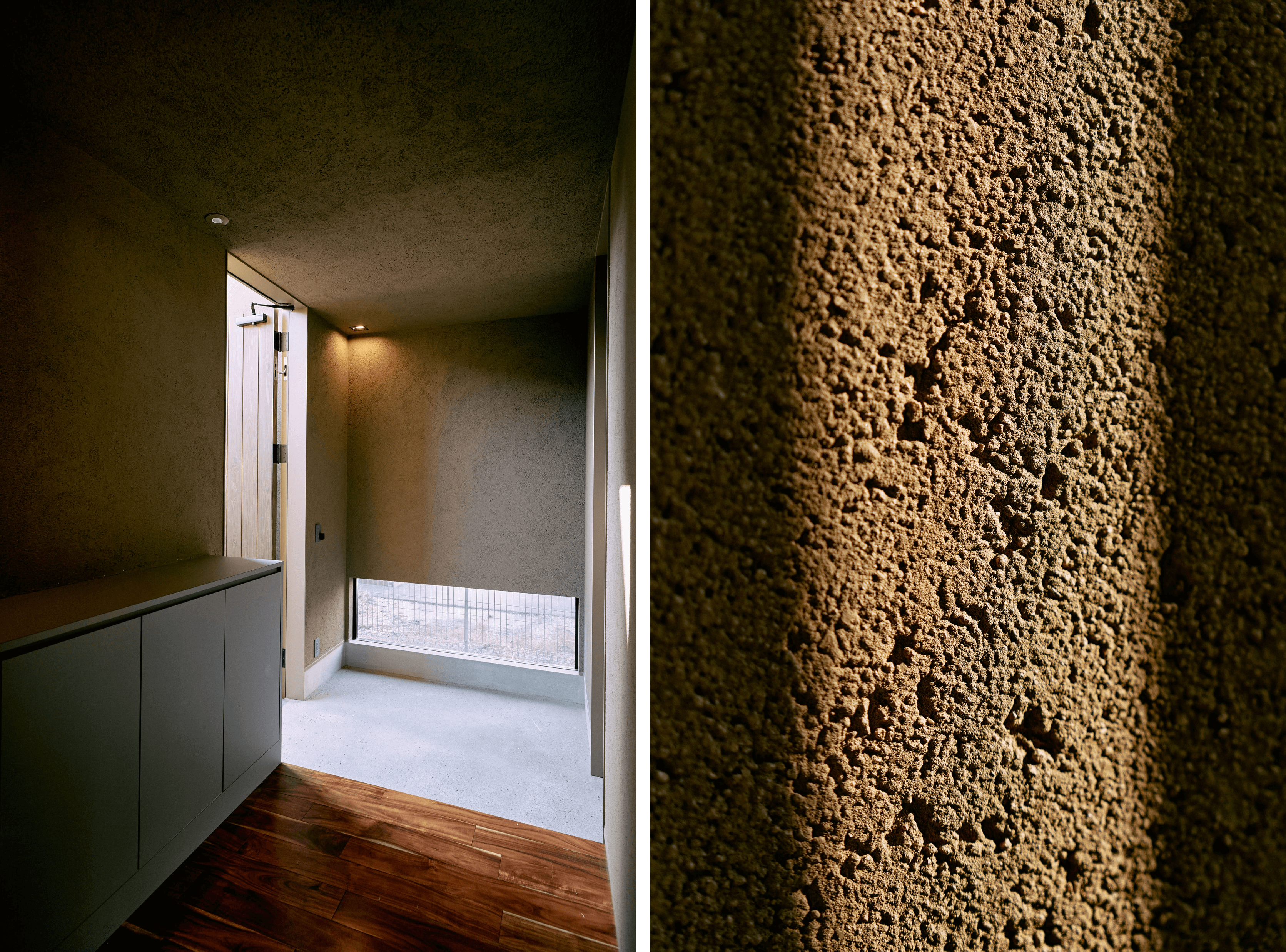 左/アドヴァン社の無釉磁器タイル『ノルディッククオーツ14』が足元を力強く引き締める玄関。エグゼクティブにふさわしい重厚な迎賓の空間として、ゲストを美しく迎え入れます。 右/天然素材を主材としたフッコー社『マヂックコート』の塗り壁。左官職人の手仕事によるマットで厚みのある仕上がりは、均一な工業製品にはない確かな温もりと深いテクスチャーをもたらします。