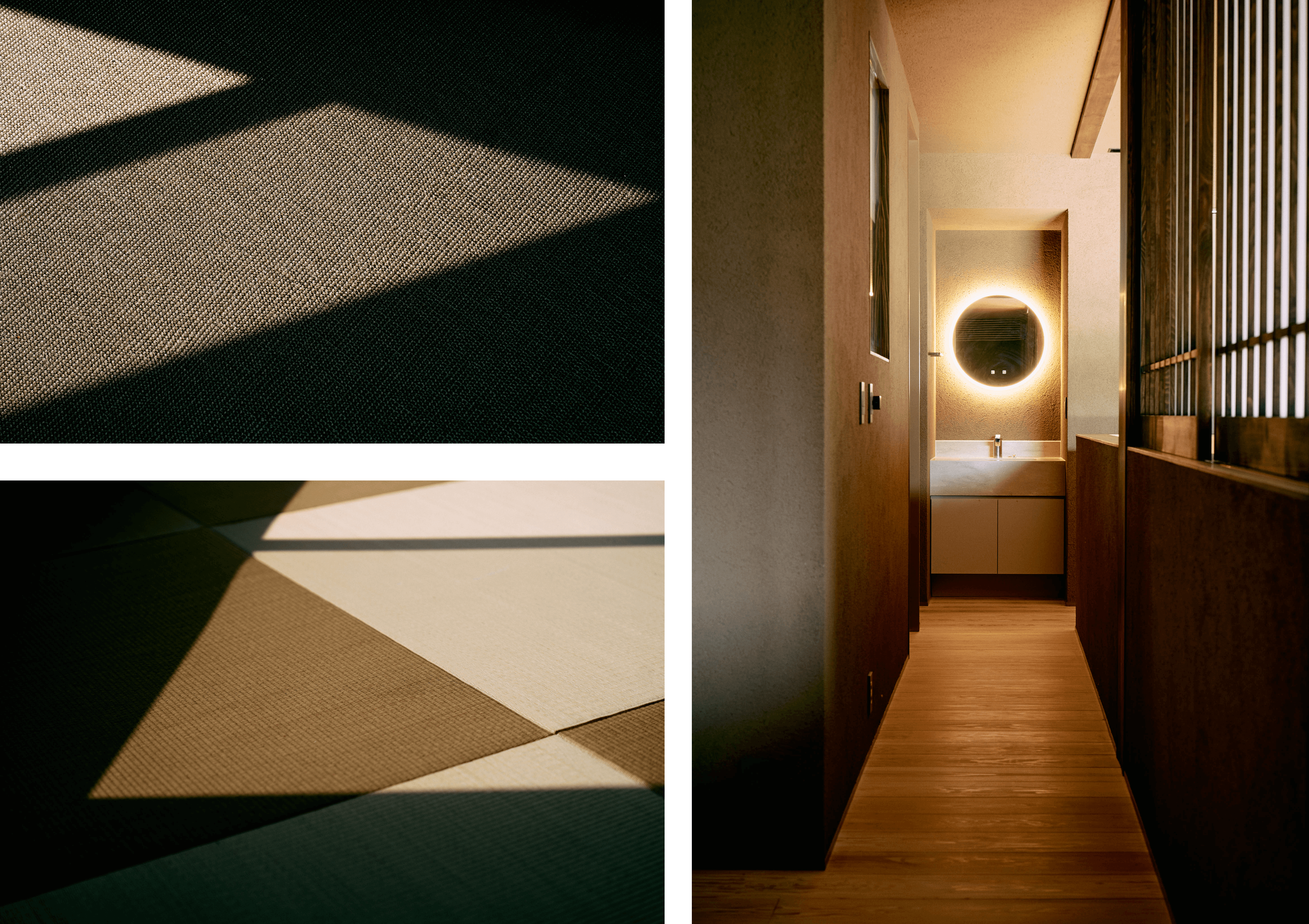 左上/天然のサイザル麻を100%使用したIOC社の『サイザルカーペット』。斜めから差し込む光が、ざっくりとした素朴な網目のテクスチャーを立体的に浮かび上がらせる陰影礼讃の世界です。左下/市松模様に敷かれた縁なし畳に、幾何学的な光と影がシャープなコントラストを描き出します。静寂と洗練が同居する、計算し尽くされた意匠の妙を感じる一枚。右/間接照明が仕込まれた丸いミラーが目を惹く、ホテルライクで洗練された洗面台。塗り壁の深い味わいと調和し、毎日利用する水回りにもラグジュアリーな気品が漂います。