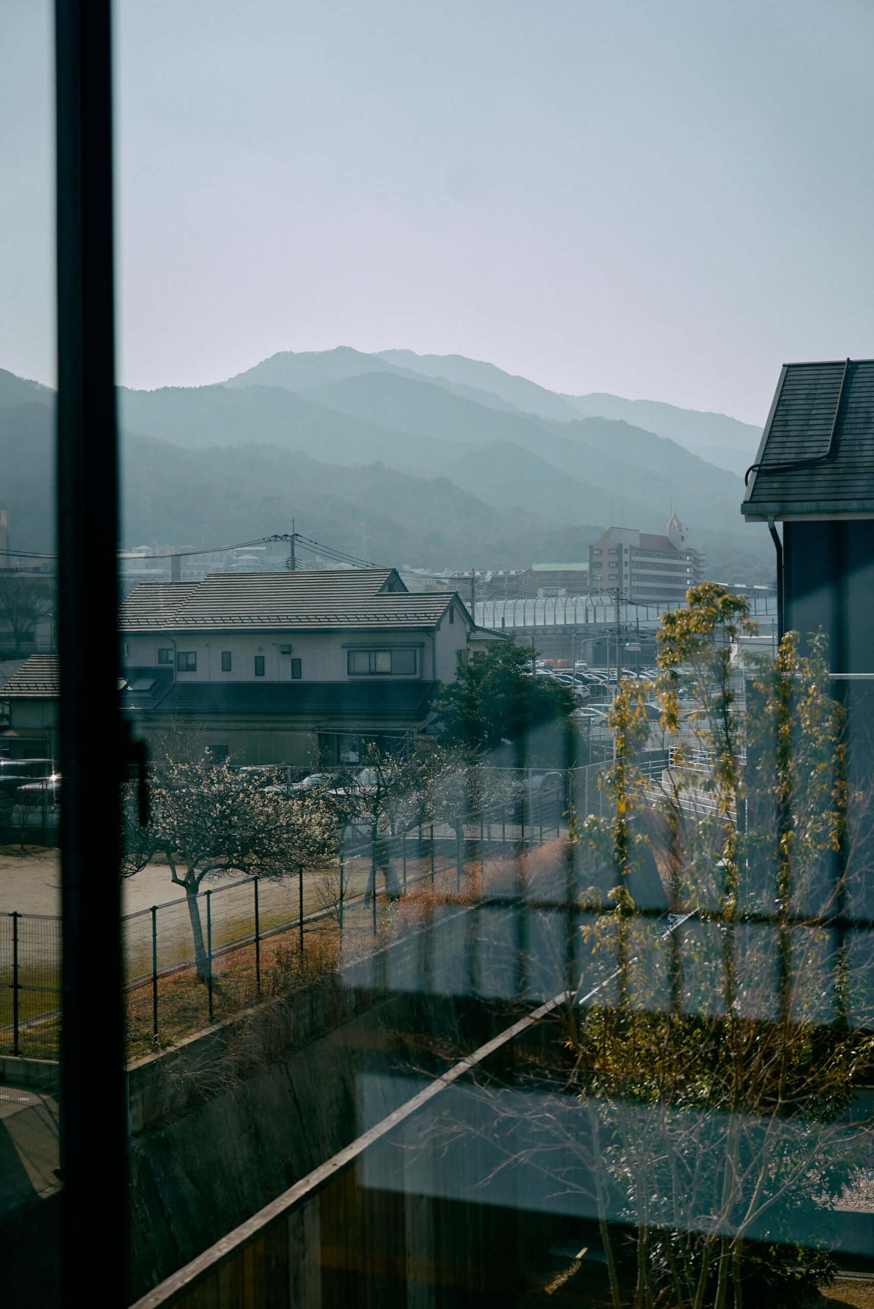 そして、ダークグレーの大きな窓枠を額縁に見立てれば、そこには穏やかな街並み越しに、豊かな緑を抱く油山の美しい稜線が借景として広がっています。
