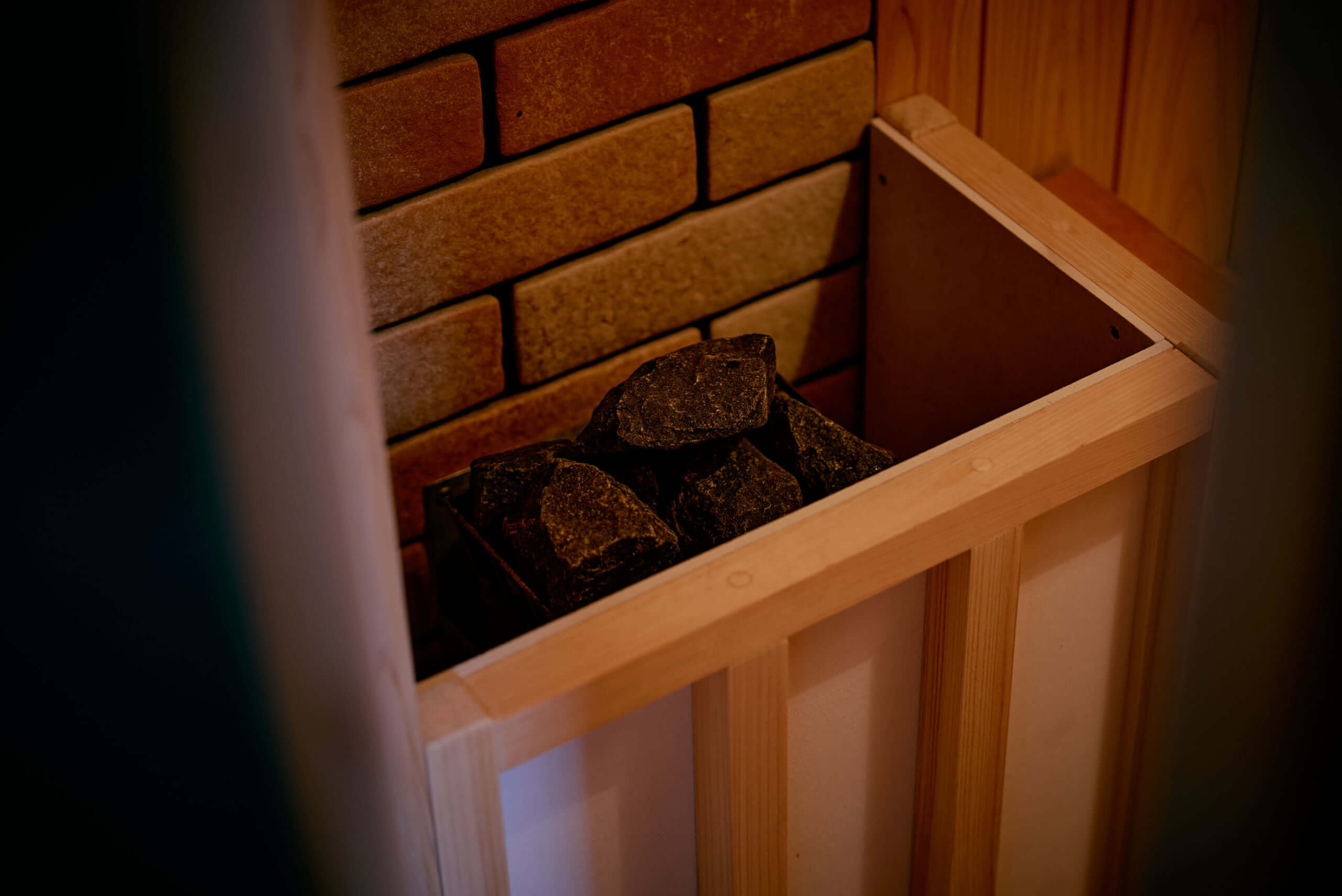 木の香りに包まれるプライベートサウナの内部。本格的なサウナストーンが備えられ、ロウリュを楽しむことも可能。自宅にいながら心身を深いレベルでリセットできます。