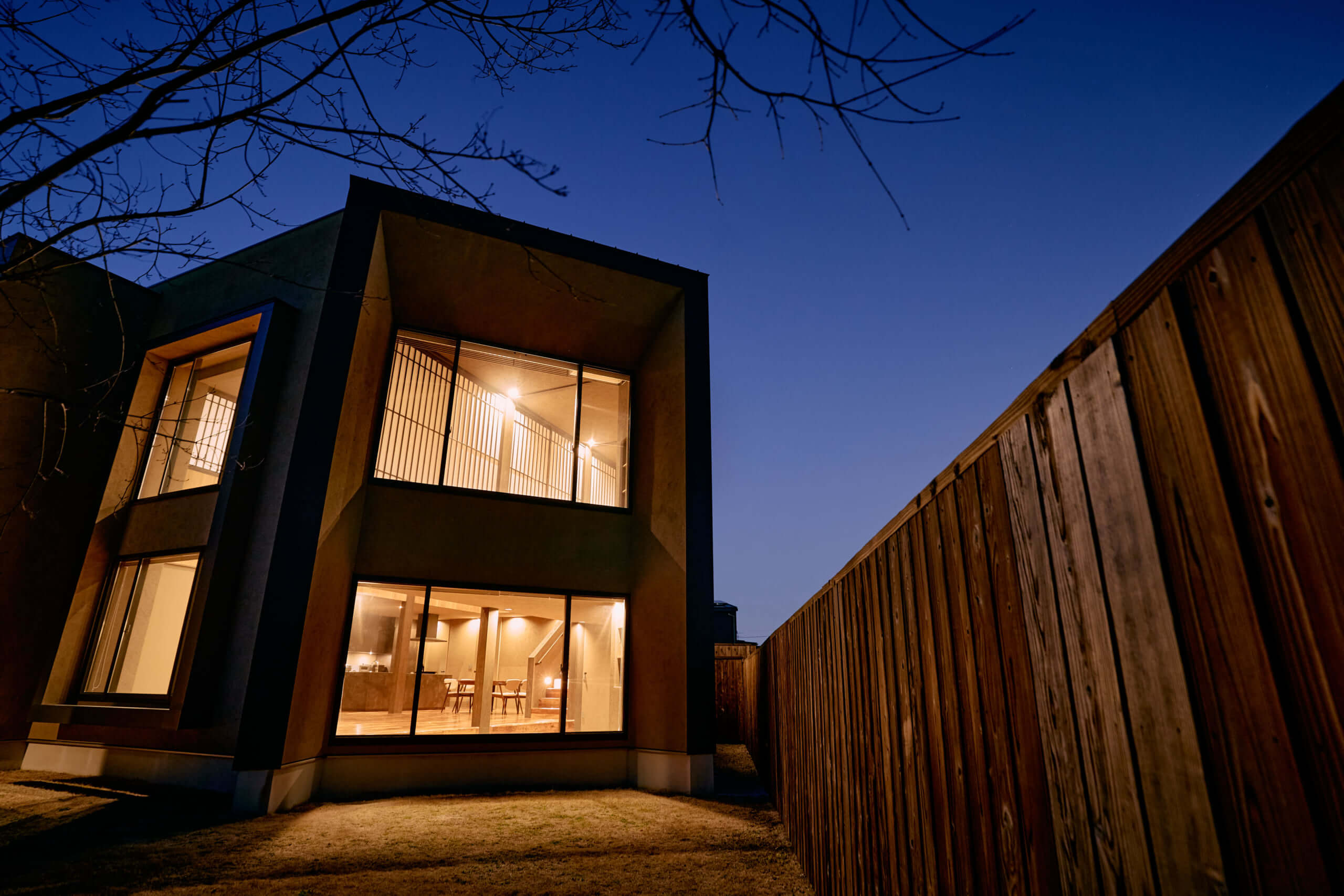 さらに庭側に回れば、暗闇の中に大きな窓枠がくっきりと浮かび上がります。そこから漏れ出るのは、和紙のペンダントライトがもたらす温かく柔らかな灯り。障子や規則正しい木格子のシルエットが影絵のように美しく映し出され、建物全体をまるで一つの巨大な行灯のように演出します。