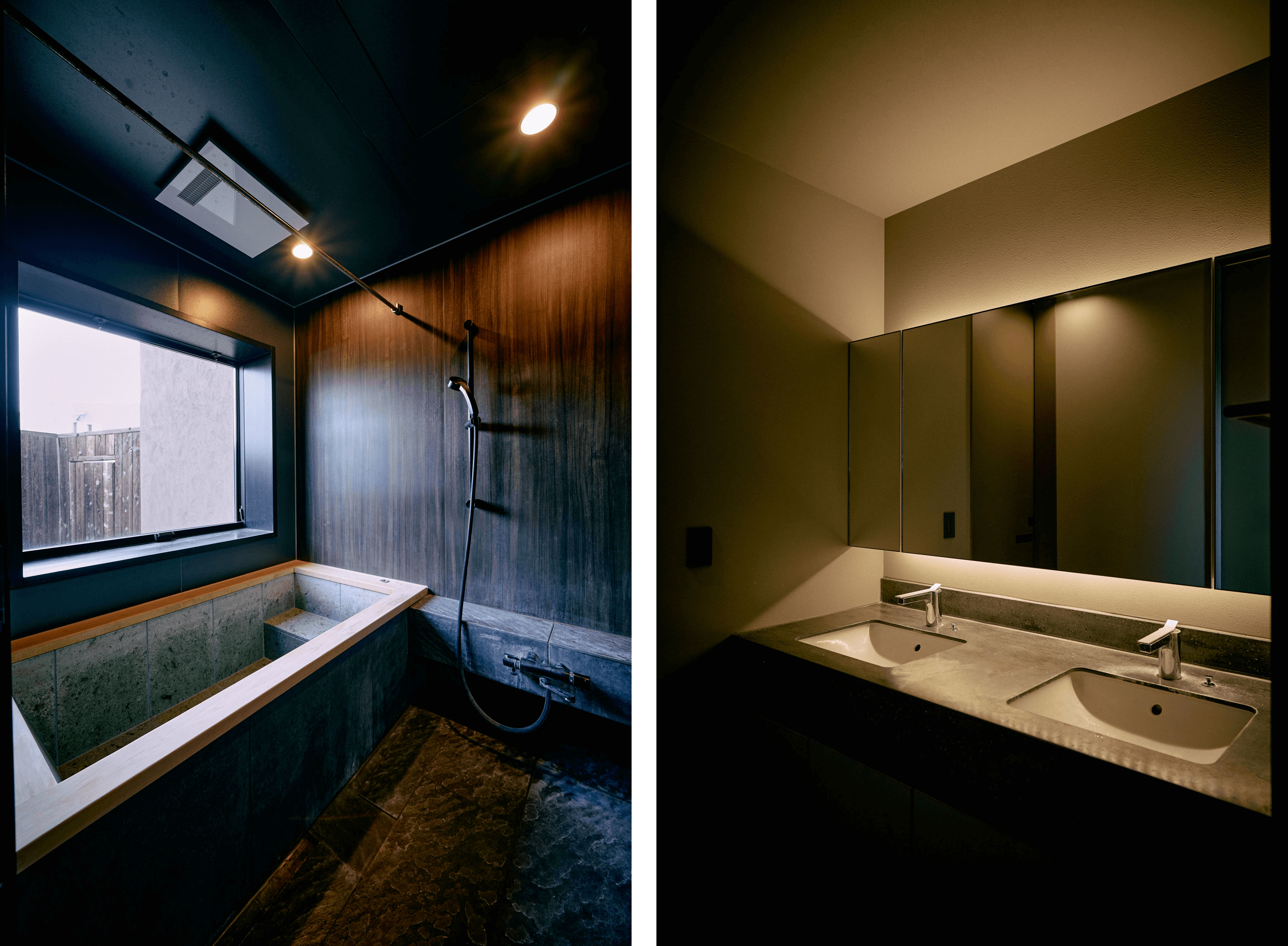 左/アステック社のラグジュアリーバス『WABURO』を採用した内風呂。目に肌に優しい十和田石と心をほどく天然桧を贅沢にあしらい、日本の伝統美が宿る至高の空間です。右/最高級のしつらえで統一された、ホテルライクなダブルボウルの洗面台。忙しい朝の身支度も、家族と並んでゆったりと優雅に行える機能的で美しいサニタリースペースです。