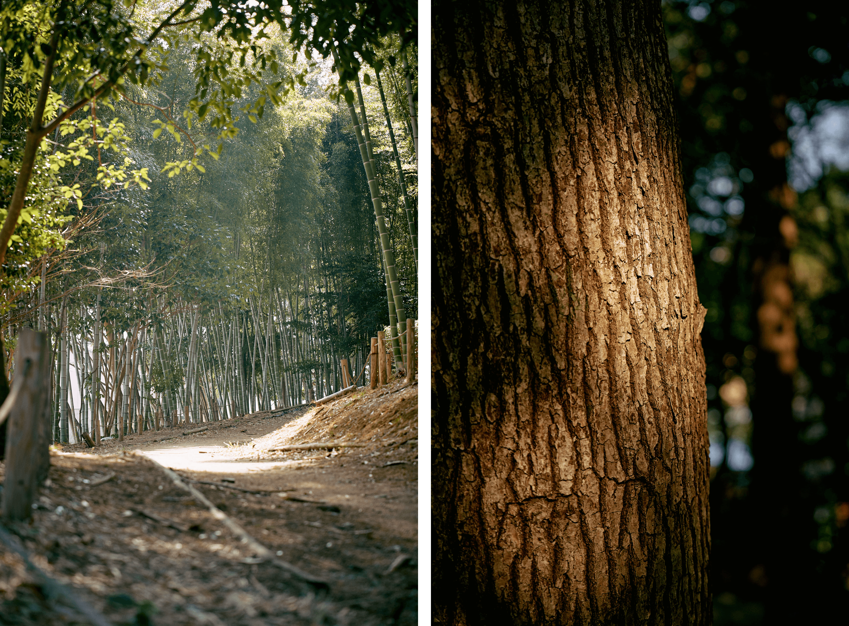 左/木漏れ日が揺れる、「西南杜の湖畔公園」の静かな竹林の遊歩道。朝の澄んだ空気の中をゆっくりと散歩すれば、自然の呼吸と同調して心身が整っていくのを感じます。右/木々の力強い樹皮のテクスチャー。人工物に囲まれた日常から離れ、本物の自然の息吹をダイレクトに感じることができる環境が、心に深いインスピレーションをもたらします。
