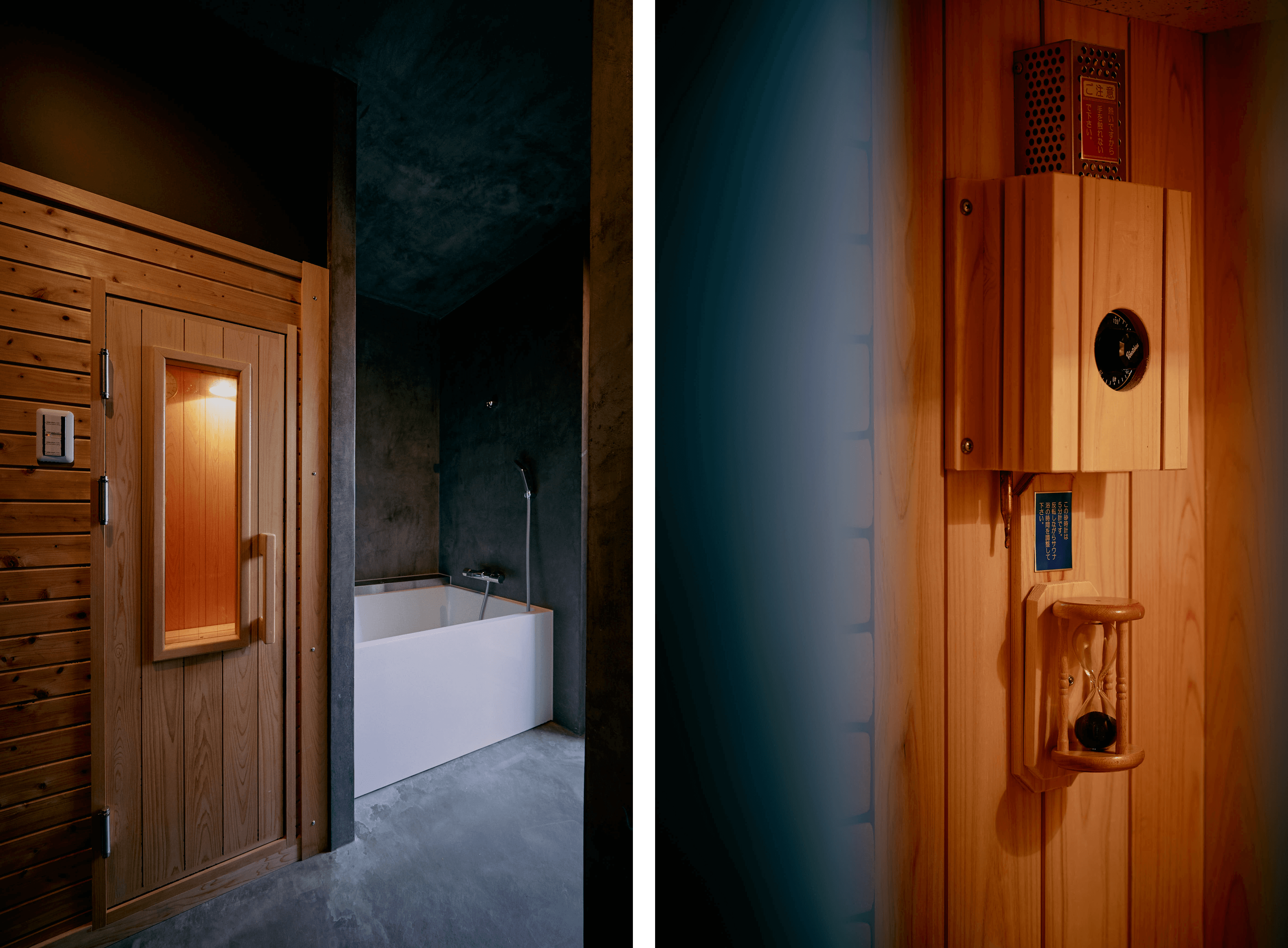 左/本格的なサウナ室のすぐ隣に完備された、水風呂用の専用バスタブ。ここから露天風呂スペースの外気浴へとスムーズに移動できる、完璧な「ととのい」の動線が設計されています。右/サウナ室内に設置された砂時計。誰の目も気にすることなく、自分だけのペースで極限まで汗を流す。エグゼクティブにとって欠かせない、日常のデトックスタイムを彩ります。